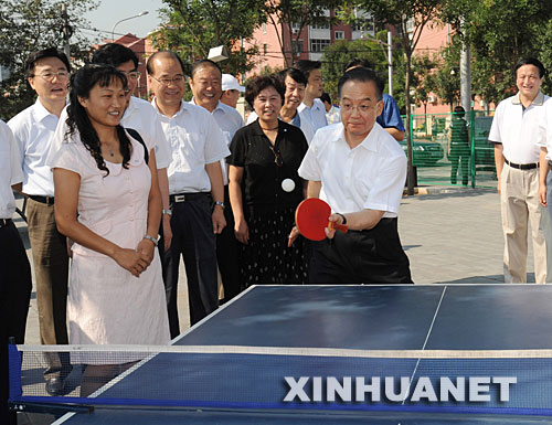 這是溫家寶在豐臺區(qū)大井社區(qū)和群眾打乒乓球。新華社記者黃敬文攝