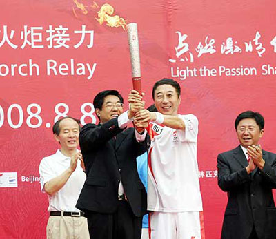 中共房山區(qū)委書記聶玉藻將火炬交給第一棒火炬手,中國廣播藝術團藝術總監(jiān)、全國十大杰出青年馮鞏