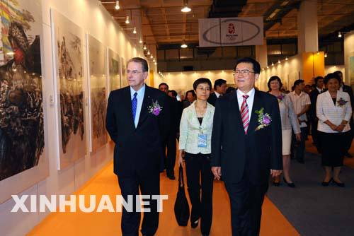 8月11日,作為奧運(yùn)文化活動(dòng)重點(diǎn)項(xiàng)目,2008奧林匹克美術(shù)大會(huì)開幕式暨頒獎(jiǎng)典禮在京舉行。中共中央政治局常委李長(zhǎng)春和國(guó)際奧委會(huì)主席羅格、終身名譽(yù)主席薩馬蘭奇出席并為獲獎(jiǎng)?wù)哳C獎(jiǎng)。 這是李長(zhǎng)春和羅格等在觀看獲獎(jiǎng)作品。(新華社記者李濤攝)