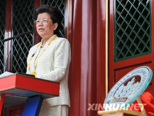 8月13日,全國人大常委會副委員長、北京奧組委副主席、北京奧運村村長陳至立在頒獎儀式上致辭。新華社記者張國俊攝