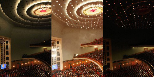 人民大會堂活動場所空間大,舉行大型活動時,工作人員根據(jù)現(xiàn)場客人入場情況按階梯式開啟照明燈,待客人大批入場時再打開全部照明燈,此舉可以節(jié)約大量照明用電。這組拼版照片顯示的是3月10日,十一屆全國人大一次會議第三次全體會議時人民大會堂內(nèi)的照明情況。左圖:會前,出席人員正在入場,照明燈部分開啟。中圖:會中,照明燈全部開啟。右圖:會后,出席人員離場,照明燈逐漸關(guān)閉,僅為整理會場的工作人員保留基本照明。新華社記者尹棟遜攝