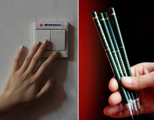 (資料圖)左圖:人民大會堂內(nèi)一處照明燈開關(guān)旁貼著“請盡量利用自然光”的提示(3月10日攝)。類似的提示隨處可見。右圖:人民大會堂供會議使用的、以廢舊報紙為原料制造的鉛筆(3月10日攝)。 新華社記者尹棟遜攝