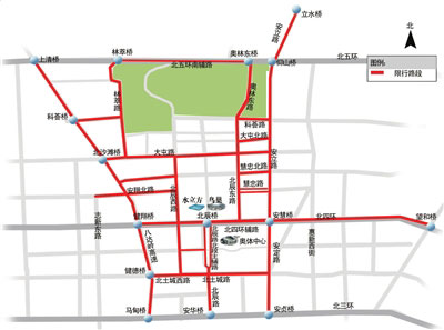 限行路段:建國(guó)門橋向北經(jīng)東二環(huán)路、北二環(huán)路主路(不含輔路)至鐘樓北橋(單向);復(fù)興門橋向北經(jīng)西二環(huán)路、北二環(huán)路主路(不含輔路)至鐘樓北橋(單向),除奧運(yùn)專用車輛、公共汽車和持有閉幕式車證的車輛外,禁止其他車輛通行。