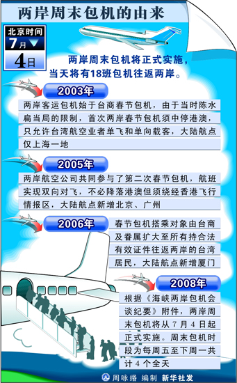 經(jīng)海協(xié)會與;鶗䥇f(xié)商,兩岸周末包機于2008年7月4日啟動。