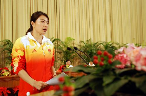 9月11日,第29屆奧運會跳水比賽女子3米跳板、女子雙人3米跳板冠軍郭晶晶在報告會上發(fā)言。當日,第29屆奧運會中國體育代表團報告會在北京人民大會堂舉行。新華社發(fā)(楊慧峰 攝)