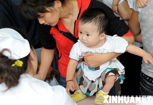 資料圖片:9月19日,家長帶著孩子在南京市兒童醫(yī)院用會議廳改成的專病門診區(qū)登記,準備接受檢查。連日來,全國各有關(guān)地方認真貫徹黨中央、國務(wù)院關(guān)于對三鹿嬰幼兒奶粉受三聚氰胺污染重大安全事故作出的重要指示精神,積極采取各種有效措施,全力救治和篩查泌尿系統(tǒng)結(jié)石患兒。新華社記者 孫參 攝