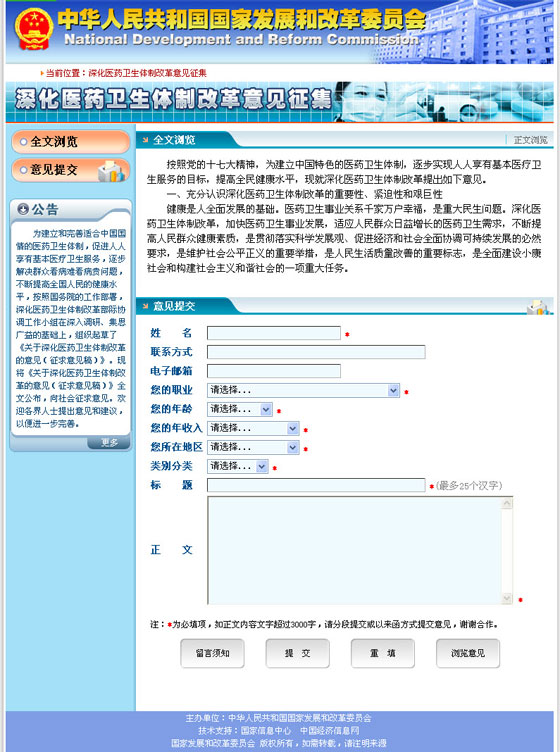 點(diǎn)擊進(jìn)入“深化醫(yī)藥衛(wèi)生體制改革意見征集”頁面 >>>