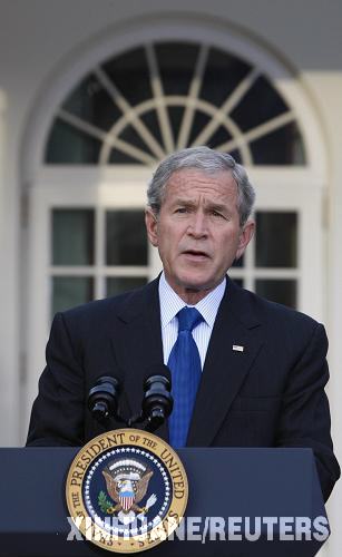 10月14日,美國總統(tǒng)布什在華盛頓白宮發(fā)表講話。布什當(dāng)天表示將推出具體的救市措施,其中包括動用救援資金購買銀行股份。 新華社/路透