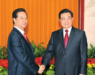 10月22日,國家主席胡錦濤在北京人民大會堂會見來華進行正式訪問并出席第七屆亞歐首腦會議的越南總理阮晉勇。