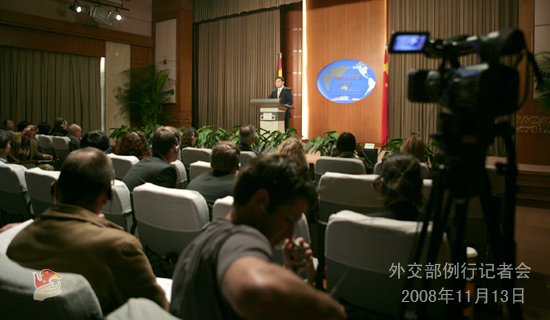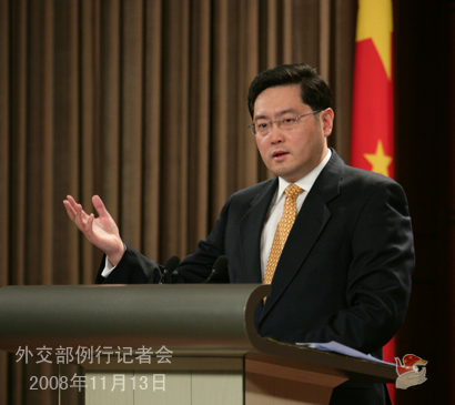 2008年11月13日,外交部發(fā)言人秦剛舉行例行記者會,就胡錦濤主席出席20國集團(tuán)領(lǐng)導(dǎo)人金融市場和世界經(jīng)濟(jì)峰會、六方會談等答問。