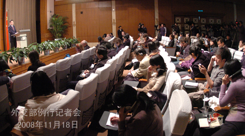 2008年11月18日,外交部發(fā)言人秦剛舉行例行記者會(huì),就胡錦濤主席出席亞太經(jīng)合組織第十六次領(lǐng)導(dǎo)人非正式會(huì)議、中美戰(zhàn)略經(jīng)濟(jì)對(duì)話等答問(wèn)。