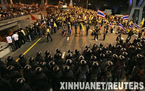 11月25日,泰國警察與反政府的人民民主聯(lián)盟(民盟)示威者在曼谷素萬那普國際機(jī)場的主路上對峙。由于民盟舉行的大規(guī)?棺h活動危及機(jī)場安全,泰國機(jī)場管理局25日晚間下令關(guān)閉首都曼谷素萬那普國際機(jī)場。 新華社/路透