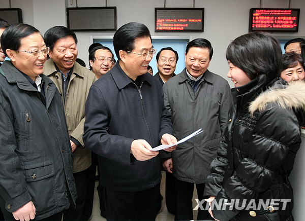 12月12日至14日,中共中央總書(shū)記、國(guó)家主席、中央軍委主席胡錦濤到遼寧考察工作。這是胡錦濤在沈陽(yáng)人力資源市場(chǎng)向前來(lái)參加大學(xué)生專場(chǎng)招聘洽談會(huì)的大學(xué)生詢問(wèn)求職情況,希望他們?cè)缛兆呱瞎ぷ鲘徫,用學(xué)到的知識(shí)為現(xiàn)代化建設(shè)作貢獻(xiàn)。新華社發(fā)