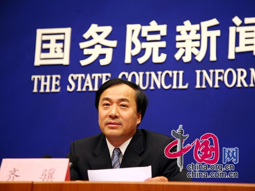 2009年1月6日10時,新聞辦公室舉行新聞發(fā)布會,請住房城鄉(xiāng)建設(shè)部副部長齊驥和發(fā)展改革委、財政部、人民銀行有關(guān)負責(zé)人介紹關(guān)于促進房地產(chǎn)市場健康發(fā)展的有關(guān)情況,并答記者問。圖為住房和城鄉(xiāng)建設(shè)部副部長齊驥介紹情況。