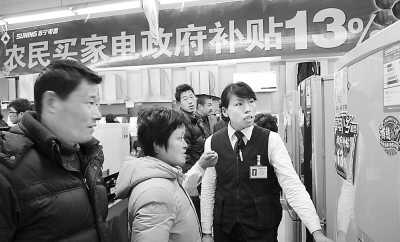 一名售貨員在南京高淳縣向農村消費者介紹家電下鄉(xiāng)指定產品。(來源:人民日報海外版)