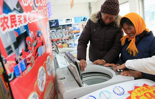 2月1日,江蘇省“家電下鄉(xiāng)”工作正式啟動。江蘇省興化市戴南鎮(zhèn)的王巧云(右)和母親來到鎮(zhèn)上的“家電下鄉(xiāng)”直營店選購洗衣機。2008年12月31日,中國政府網(wǎng)發(fā)布了《國務院辦公廳關于搞活流通擴大消費的意見》,意見提出全面推進家電下鄉(xiāng)工作。從2009年2月1日起,將家電下鄉(xiāng)從10多個省區(qū)市推廣到全國。同時,把摩托車、電腦、熱水器(含太陽能、燃氣、電力類)和空調等產品列入家電下鄉(xiāng)政策補貼范圍,由各。▍^(qū)、市)根據(jù)當?shù)匦枨髲闹羞x擇增加部分補貼品種。 新華社發(fā) (顧祥忠 攝)