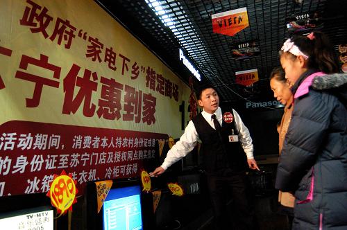 兗州市九彩家電公司作為山東省中標的允許銷售下鄉(xiāng)家電的企業(yè),春節(jié)期間,商店外面擺滿了各種家電,其中大部分具有家電下鄉(xiāng)標識。九彩家電的銷售部劉經(jīng)理介紹,家電下鄉(xiāng)活動中標的絕大多數(shù)企業(yè)專門研發(fā)了針對農村市場的節(jié)能、環(huán)保、耐用、安全新產品。如具有寬電壓、強信號、防鼠板、防雷防潮防震設計、高可靠性包裝等特點。這些企業(yè)實力強、信譽好、網(wǎng)絡健全,不僅可以保證為農民提供貨真價實的產品,可以提供方便周到的服務。