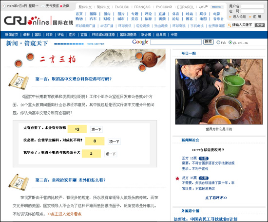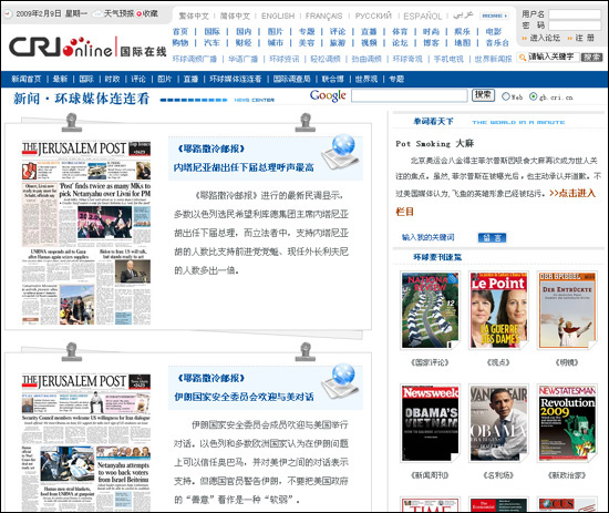 國際在線中文網(wǎng)新聞?lì)l道還對(duì)中國國際廣播電臺(tái)的優(yōu)勢內(nèi)容資源進(jìn)行了梳理和整合,將環(huán)球資訊廣播的《老外看點(diǎn)》和《單詞看天下》等欄目以及《世界新聞報(bào)》等品牌資源移植到網(wǎng)絡(luò),網(wǎng)友可以在線收聽或?yàn)g覽,并參與互動(dòng)交流。
