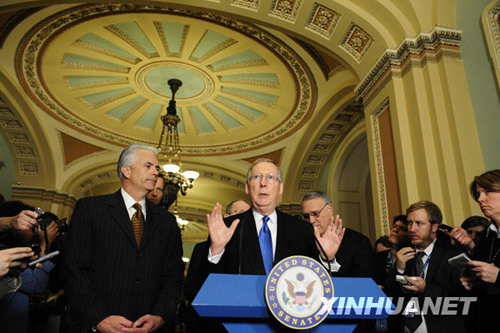 2月10日,美國國會參議院少數(shù)黨領(lǐng)袖麥康奈爾(中)在國會山出席記者會。當(dāng)日,美國國會參議院在最終投票中以61票對37票的投票結(jié)果,批準(zhǔn)了總額為8380億美元的經(jīng)濟(jì)刺激計(jì)劃。新華社記者張巖攝