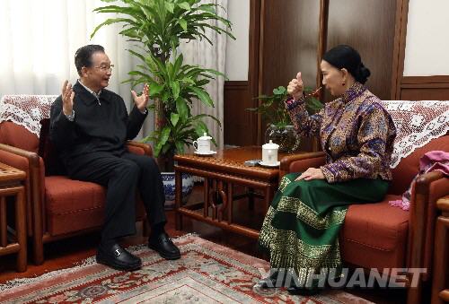2月14日,國務(wù)院總理溫家寶邀請著名傣族舞蹈表演藝術(shù)家刀美蘭到中南?偫磙k公室做客,與她一起探討如何更好地傳承和發(fā)揚(yáng)光大少數(shù)民族文化藝術(shù)。(新華社記者姚大偉攝)