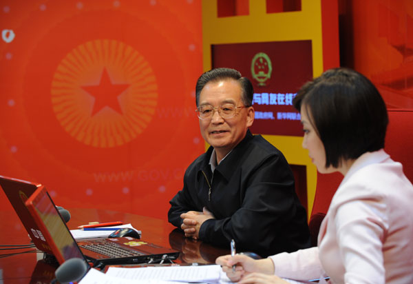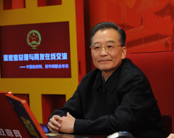 2月28日15時(shí),中共中央政治局常委、國(guó)務(wù)院總理溫家寶與網(wǎng)友在線(xiàn)交流并接受中國(guó)政府網(wǎng)、新華網(wǎng)聯(lián)合專(zhuān)訪。中國(guó)政府網(wǎng)和新華網(wǎng)將全程進(jìn)行文字和視頻直播。圖為溫家寶接受中國(guó)政府網(wǎng)和新華網(wǎng)聯(lián)合訪談,同網(wǎng)民在線(xiàn)交流。新華社記者 李學(xué)仁 攝