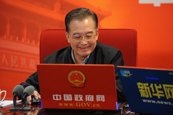 2月28日15時,中共中央政治局常委、國務(wù)院總理溫家寶與網(wǎng)友在線交流并接受中國政府網(wǎng)、新華網(wǎng)聯(lián)合專訪。中國政府網(wǎng)和新華網(wǎng)將全程進(jìn)行文字和視頻直播。 圖為溫家寶瀏覽中國政府網(wǎng)訪談頁面。新華社記者 李學(xué)仁 攝