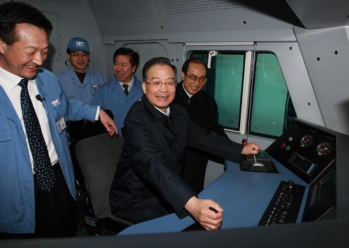 中國(guó)北車集團(tuán)大連機(jī)車車輛有限公司始建于1899年,今年恰逢建廠110周年。21日上午,溫家寶來(lái)到這家企業(yè)的機(jī)車車間,走進(jìn)自主研制的“和諧型”9600千瓦大功率電力機(jī)車的駕駛室仔細(xì)觀看。他說(shuō),我們?cè)陔娏C(jī)車上已經(jīng)走在了世界前列,這是中國(guó)人的驕傲,希望企業(yè)全體職工繼續(xù)努力,讓“和諧號(hào)”不僅跑遍全中國(guó),而且跑遍全世界。