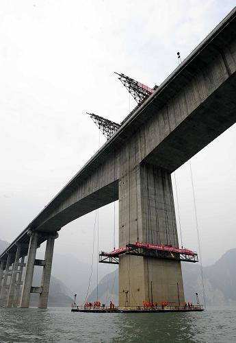 3月22日拍攝的廟子坪特大橋修補施工外景。當(dāng)日,位于四川省紫坪鋪水庫的都汶公路廟子坪特大橋開始進(jìn)行首次深水條件下的修補施工。橫跨紫坪鋪水庫的廟子坪大橋全長1436米,橋墩高100多米。汶川地震中,大橋從中間斷裂,橋墩出現(xiàn)裂縫。廟子坪大橋修復(fù)工程計劃于4月底全部結(jié)束,以保障都江堰至映秀高速公路于5月12日震發(fā)1周年之際恢復(fù)通車。 新華社記者 陳凱 攝