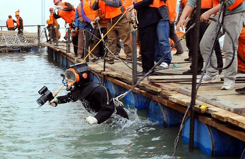 3月22日,戴著面罩、備有腳蹼、橡皮衣、氧氣筒,來自廣東的22歲“蛙人”唐復(fù)才,手持電筒和攝像頭躍入岷江,參與位于四川省紫坪鋪水庫的都汶公路廟子坪特大橋水下修復(fù)工作。記者了解到,此次修復(fù)要求“蛙人”潛入水下,對水深60多米的橋墩底部原有砼進(jìn)行清洗、鑿毛、堵孔。要在深水下進(jìn)行這一系列作業(yè),在世界上尚屬首例。