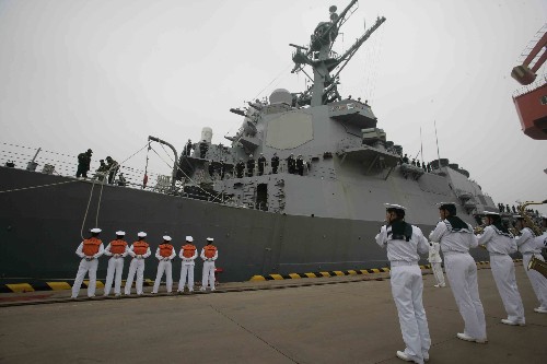 4月19日,參加紀(jì)念中國人民解放軍海軍成立60周年多國海軍活動(dòng)的美國海軍“菲茨杰拉德”號(hào)導(dǎo)彈驅(qū)逐艦抵達(dá)青島港。 新華社記者 王建民 攝