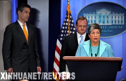 4月26日,在美國首都華盛頓,美國國土安全部長珍妮特·納波利塔諾(右)在新聞吹風會上講話。當日,白宮就美國出現(xiàn)人感染豬流感病例舉行新聞吹風會,宣布美國豬流感患者增至20人,美進入公共衛(wèi)生緊急事態(tài)。美國國土安全部長珍妮特·納波利塔諾、美國疾病控制和預防中心代理主任理查德·貝塞爾(左)等出席了新聞吹風會。 新華社/路透