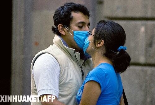 4月25日,在墨西哥首都墨西哥城,一對情侶戴著口罩接吻。墨西哥衛(wèi)生部官員何塞·科爾多瓦當日通報說,截至24日晚間,墨西哥共有20人直接因感染豬流感病毒死亡,全國疑似病例達4000余人。 新華社/法新