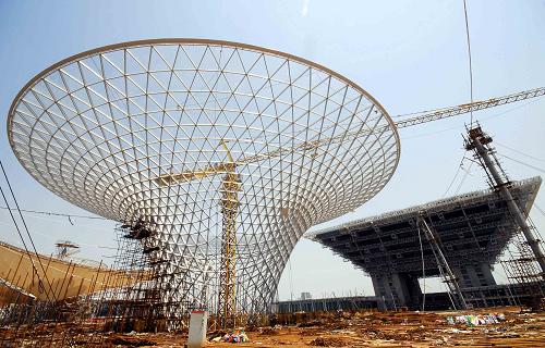 世博軸4號(hào)“陽(yáng)光谷”率先亮相,與中國(guó)館遙相呼應(yīng)(4月25日攝)。由6個(gè)巨型圓錐狀鋼結(jié)構(gòu)組成的世博軸“陽(yáng)光谷”,將于今年上半年全部亮相!瓣(yáng)光谷”采用鋼結(jié)構(gòu),讓自然光傾瀉而下,滿足部分地下空間的采光,體現(xiàn)環(huán)保、節(jié)約辦世博的理念。新華社發(fā)