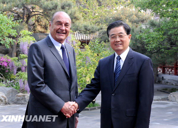 4月28日,國(guó)家主席胡錦濤在北京釣魚臺(tái)國(guó)賓館會(huì)見法國(guó)前總統(tǒng)希拉克。新華社記者李學(xué)仁攝