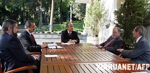 4月29日,墨西哥總統(tǒng)卡爾德龍(中)在墨西哥城總統(tǒng)府召見衛(wèi)生部長科爾多瓦(左二)。墨西哥韋拉克魯斯州政府當日證實,墨西哥首例人感染豬流感患者目前已痊愈,恢復正常生活。(新華社/法新)