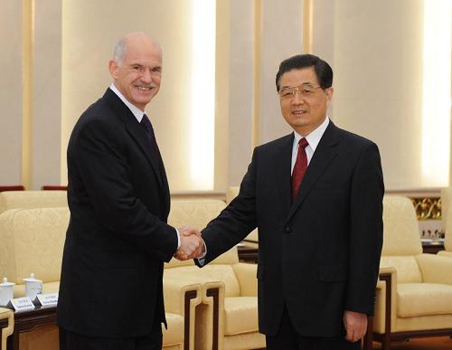 5月15日,中共中央總書記、國(guó)家主席胡錦濤在北京人民大會(huì)堂會(huì)見(jiàn)來(lái)華出席可持續(xù)發(fā)展問(wèn)題研討會(huì)的社會(huì)黨國(guó)際主席帕潘德里歐等外方代表。這是胡錦濤與帕潘德里歐握手。新華社記者李學(xué)仁攝