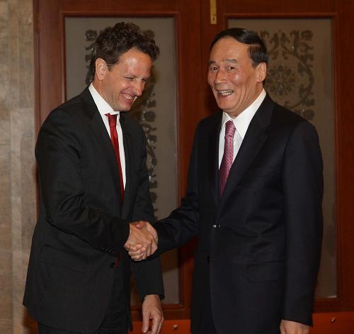 6月1日,國務(wù)院副總理王岐山在北京人民大會堂會見美國總統(tǒng)特別代表、財政部長蓋特納。新華社記者 劉衛(wèi)兵 攝