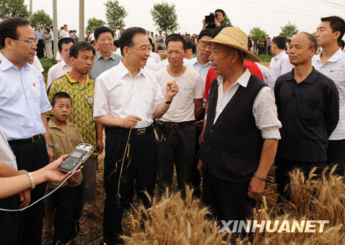 6月5日至7日,中共中央政治局常委、國務(wù)院總理溫家寶在西安考察。這是6月6日,溫家寶在西安市郊的斗門鎮(zhèn)中豐店村考察小麥萬畝高產(chǎn)示范田時,向正在收麥的農(nóng)民了解小麥?zhǔn)粘。新華社記者黃敬文攝