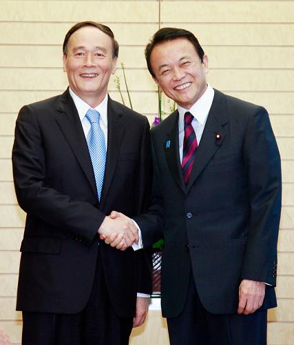 6月8日,日本首相麻生太郎(右)在東京首相官邸會見出席第二次中日經(jīng)濟高層對話的中國國務(wù)院副總理王岐山。新華社記者 任正來 攝