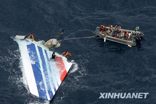 6月8日,在巴西東北部城市累西腓東北部1200公里的海域,巴西海軍在打撈失事的法航A330客機(jī)殘骸。新華社發(fā)