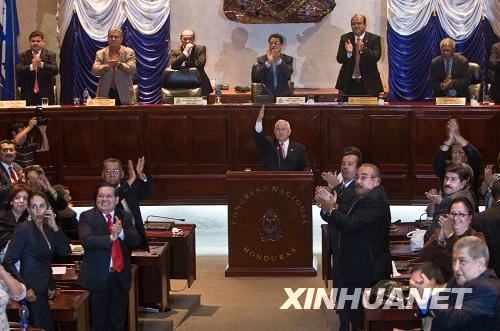 6月28日,洪都拉斯議會(huì)議長(zhǎng)羅伯托·米凱萊蒂(中)在首都特古西加爾巴宣誓就任該國(guó)臨時(shí)總統(tǒng)后向議會(huì)其他成員致意。洪都拉斯議會(huì)在當(dāng)天舉行的緊急會(huì)議上經(jīng)過(guò)磋商和激烈辯論,通過(guò)了由議長(zhǎng)米凱萊蒂出任國(guó)家臨時(shí)總統(tǒng)的決議。 新華社發(fā)(戴維攝)