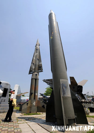 這張5月27日拍攝的資料照片顯示,一名韓國人在首都首爾觀看一枚朝鮮導(dǎo)彈(右)和一些韓國導(dǎo)彈的模型。新華社/法新
