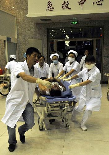 7月6日凌晨,醫(yī)護(hù)人員在新疆維吾爾自治區(qū)急救中心搶救傷者。新華社記者 沈橋 攝