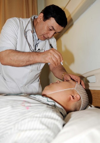 7月13日,新疆醫(yī)科大學(xué)第一附屬醫(yī)院急救中心主任帕爾哈提在為傷員檢查!7·5”事件發(fā)生后,帕爾哈提立即組織急救中心人員全部到位,為傷員清創(chuàng)縫合,提供及時(shí)的醫(yī)療救援保障。 “擔(dān)架!”“抬病人!”“手術(shù)!”——從“7·5”事件發(fā)生起,烏魯木齊市各大醫(yī)院就在這樣急切的呼喊聲中,開(kāi)始了一場(chǎng)爭(zhēng)分奪秒的搶救生命接力賽。 在與死神展開(kāi)的生命爭(zhēng)奪戰(zhàn)中,記者耳聞目睹了烏魯木齊醫(yī)護(hù)人員全力搶救受傷的各族群眾的感人事跡,他們以實(shí)際行動(dòng)譜寫了一曲新時(shí)代的民族團(tuán)結(jié)之歌。新華社記者 沙達(dá)提 攝