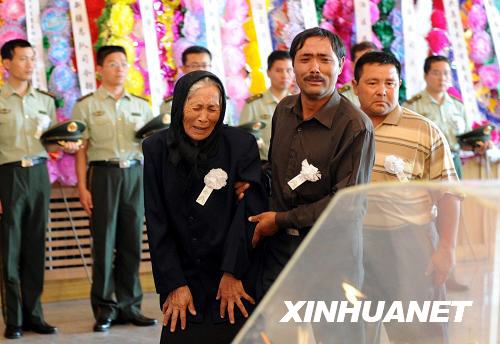 7月17日,萬金剛生前的鄰居、94歲的維吾爾族老人阿依木薩汗(左一)等前來送別萬金剛烈士。當(dāng)日,在烏魯木齊“7·5”事件中壯烈犧牲的武警中隊長萬金剛烈士遺體告別儀式在烏魯木齊市殯儀館舉行。新華社記者 沙達(dá)提 攝
