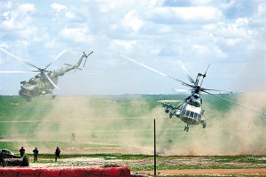 兩架俄軍武裝直升機(jī)在坦克配合下,從東方靠近“坤山鎮(zhèn)”,實(shí)施空降。大約20名俄軍士兵從機(jī)艙中翻滾而出,落地后迅速向鎮(zhèn)內(nèi)發(fā)起沖鋒。與此同時,中方特種兵空降后從鎮(zhèn)西展開夾擊。這兩股兵力在裝甲車輛配合下,很快攻克了恐怖分子在“坤山鎮(zhèn)”的幾個重要據(jù)點(diǎn)。一批恐怖分子被俘,另一批倉皇出逃的恐怖分子則被包圍過來的中方反恐兵力擒獲。