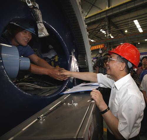 7月25日至27日,中共中央政治局常委、國務(wù)院總理溫家寶到吉林考察。這是7月25日,溫家寶在地處吉林市的明陽大通風(fēng)電技術(shù)有限公司風(fēng)力發(fā)電機(jī)總裝車間與工人握手、交談。 新華社記者 姚大偉 攝
