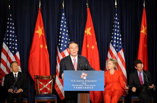 7月28日,中國國務(wù)院副總理王岐山(前)在美國首都華盛頓發(fā)表首輪中美戰(zhàn)略與經(jīng)濟對話閉幕聲明。當(dāng)天,首輪中美戰(zhàn)略與經(jīng)濟對話在華盛頓閉幕,中國國家主席胡錦濤特別代表、國務(wù)院副總理王岐山和國務(wù)委員戴秉國與美國總統(tǒng)巴拉克·奧巴馬特別代表、國務(wù)卿希拉里·克林頓和財政部長蒂莫西·蓋特納共同主持了為期兩天的對話。新華社記者 申宏 攝