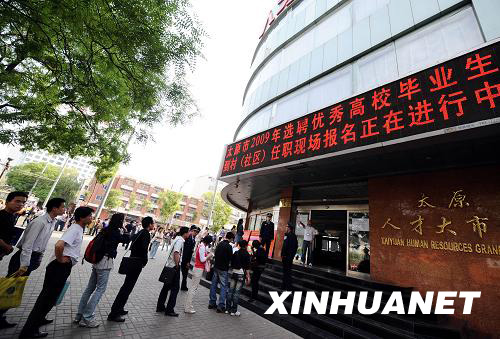 5月5日,在太原市人才大市場報(bào)名點(diǎn),報(bào)考“村官”的大學(xué)生排隊(duì)進(jìn)場。5月4日至8日,山西太原市2009年選聘優(yōu)秀高校畢業(yè)生到村(社區(qū))任職進(jìn)行報(bào)名。據(jù)了解,2009年山西省將選聘9030名優(yōu)秀高校畢業(yè)生到村(社區(qū))任職。新華社記者燕雁攝