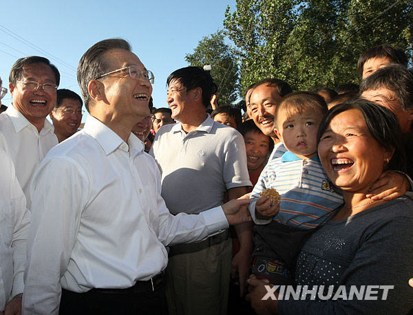 28日至29日,溫家寶來到內蒙古自治區(qū)赤峰市敖漢旗、通遼市奈曼旗,這里旱災發(fā)生范圍廣、面積大、程度重。他深入田間地頭,實地察看農作物受災和當?shù)乜购登闆r,走訪農戶,了解人畜飲水和口糧供應情況,代表黨中央、國務院看望慰問災區(qū)群眾,檢查指導抗旱救災工作。